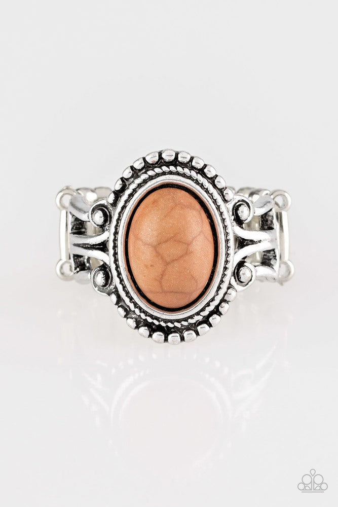 An earthy Sandstone stone is pressed into the center of a silver band radiating with silver studs for a seasonal look. Features a stretchy band for a flexible fit.