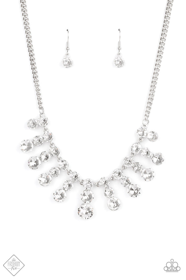 Glittery stacks of glassy white rhinestones gradually increase in size as they drip from the bottom of a classic silver chain, creating a blinding fringe that fans out below the collar. Features an adjustable clasp closure.