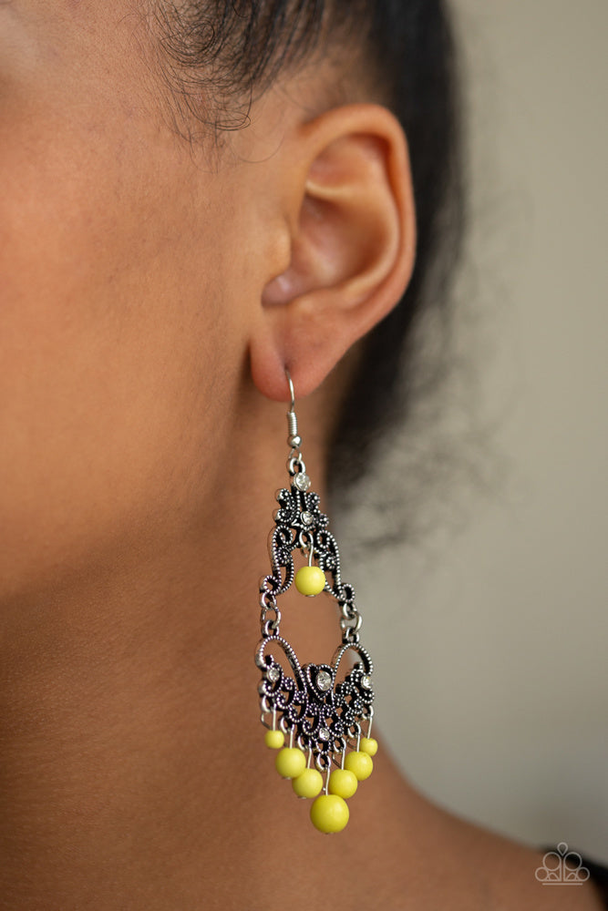 Infused with hints of glittery white rhinestones, dotted silver filigree swirls into a decorative frame. Polished yellow beads swing from the bottom and top of the ornate frame, adding colorful movement to the whimsical piece. Earring attaches to a standard fishhook fitting.