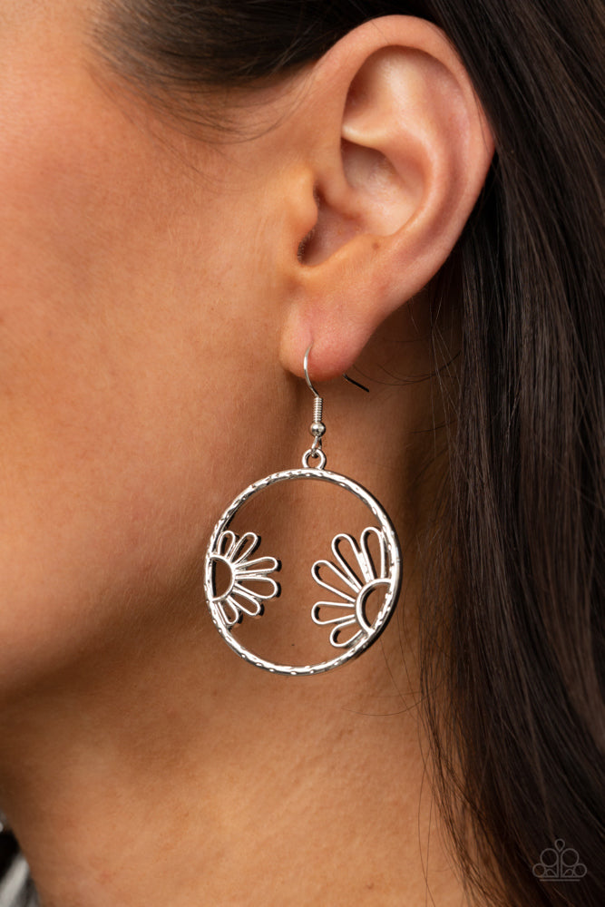 A pair of airy daisies bloom inside a hammered silver hoop, creating a whimsically seasonal display. Earring attaches to a standard fishhook fitting.