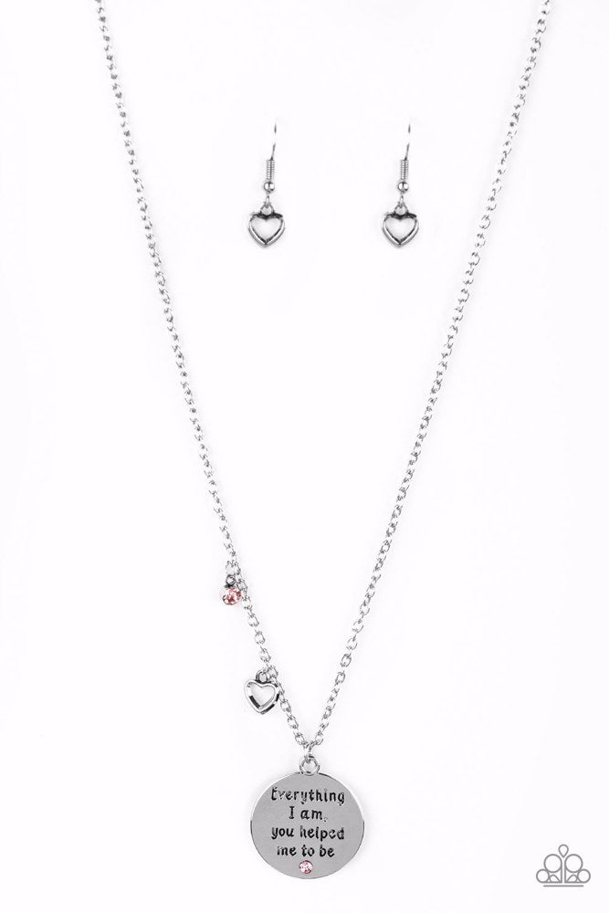 A solitaire pink rhinestone, dainty silver heart, and a shimmery silver disc stamped with the inspirational phrase, "Everything I am, you helped me to be", swings below the collar for a whimsical look. Features an adjustable clasp closure.