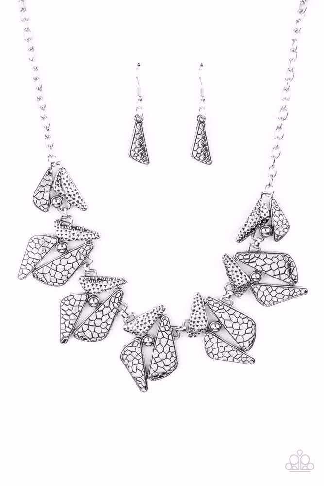 Hammered and embossed in nature inspired patterns, mismatched triangular silver and studded frames delicately link below the collar for an adventurous look. Features an adjustable clasp closure.