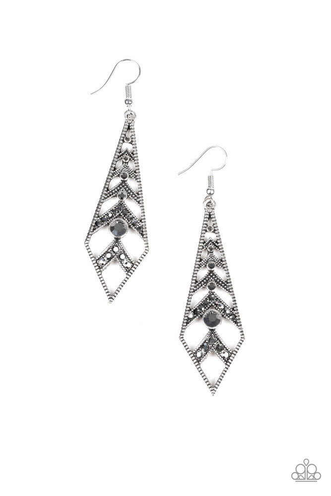 Dotted in a collection of glittery hematite rhinestones and shimmery studded textures, a flared silver frame swings from the ear for a refined flair. Earring attaches to a standard fishhook fitting.