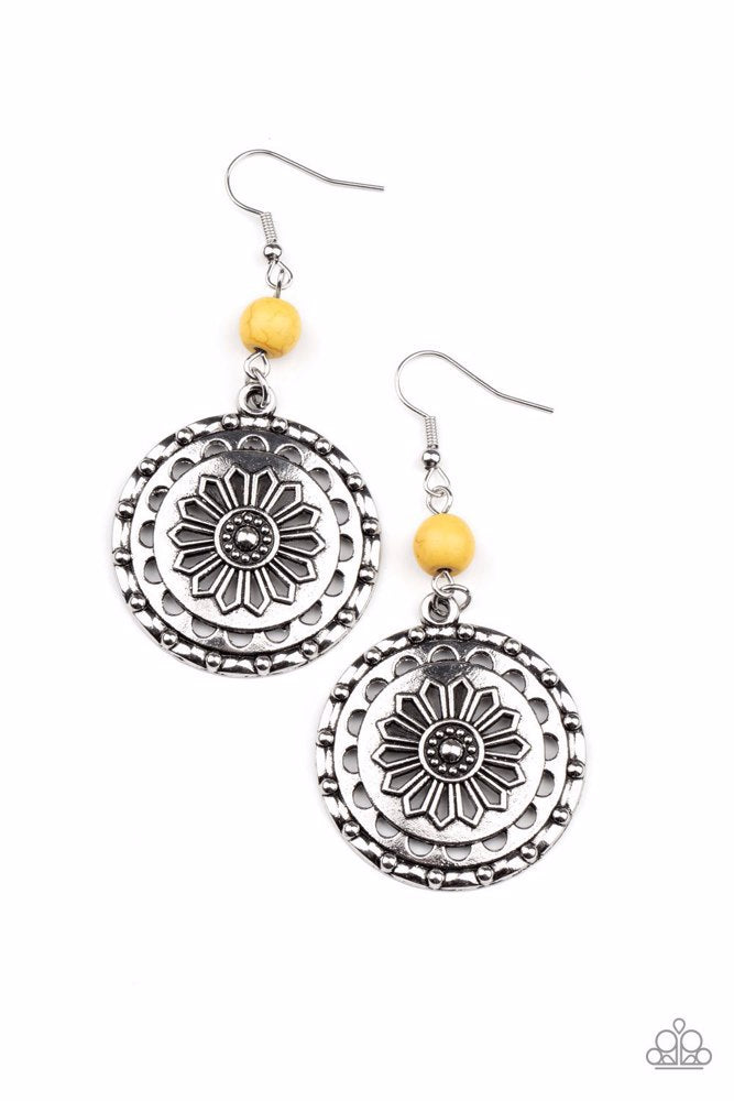 A sunny yellow stone bead gives way to a studded silver frame embossed in a whimsical daisy pattern, creating a rustic lure. Earring attaches to a standard fishhook fitting.