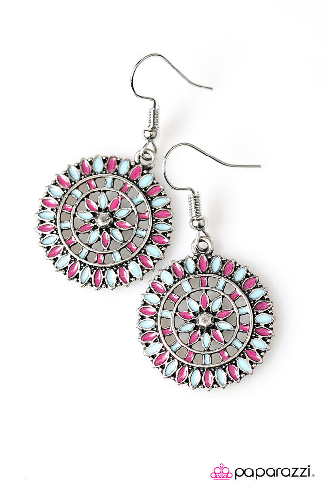 Painted in blue and pink, colorful petals spin into a whimsical floral frame. Earring attaches to a standard fishhook fitting.