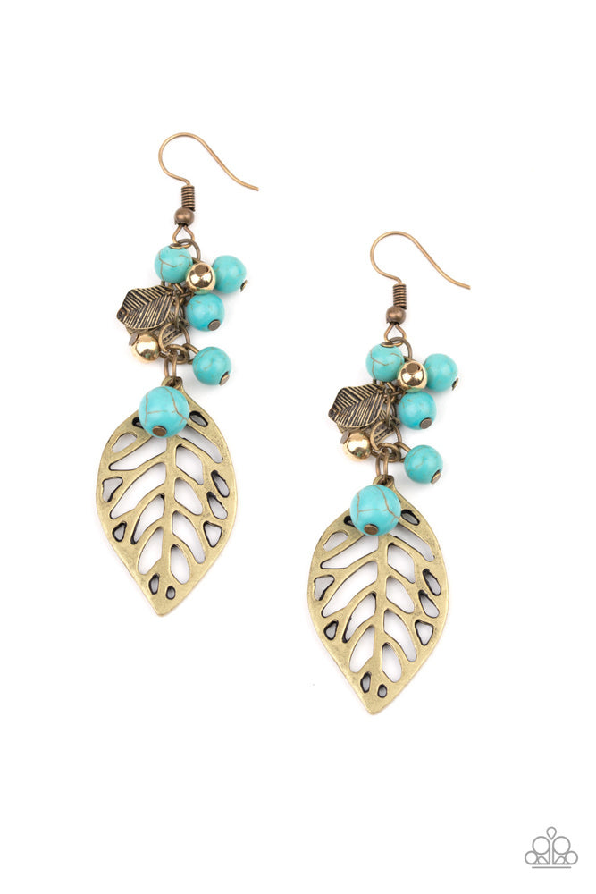 A collection of dainty brass leaf charms and refreshing turquoise stone beads trickle along a shimmery brass chain, giving way to a larger brass leaf frame for a seasonal flair. Earring attaches to a standard fishhook fitting.