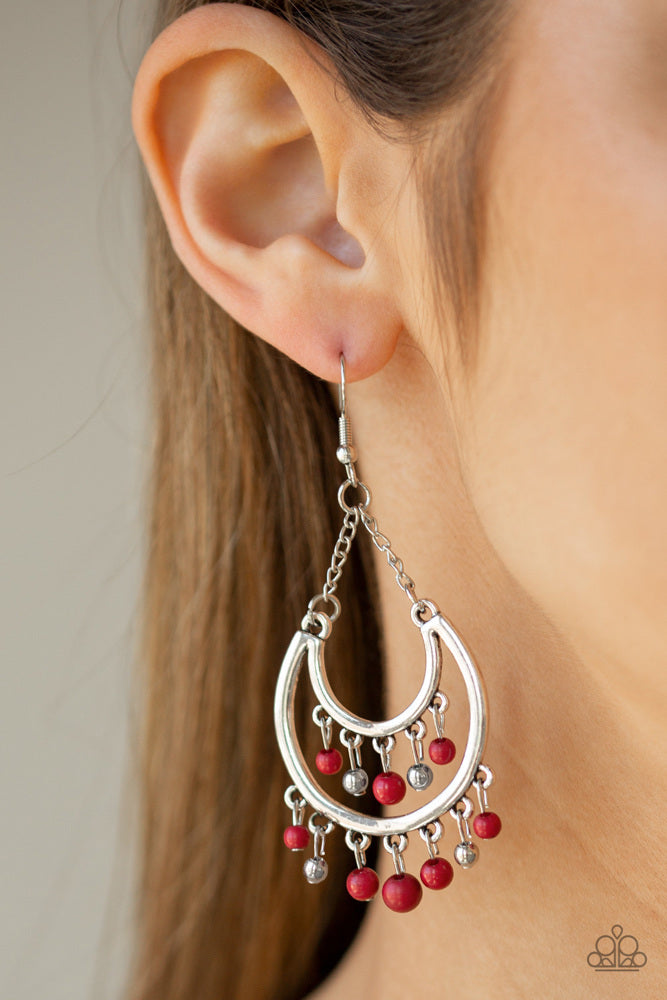 Dainty red and silver beads swing from the top and bottom of a shimmery silver half-moon frame, creating a vivacious fringe. Earring attaches to a standard fishhook fitting.