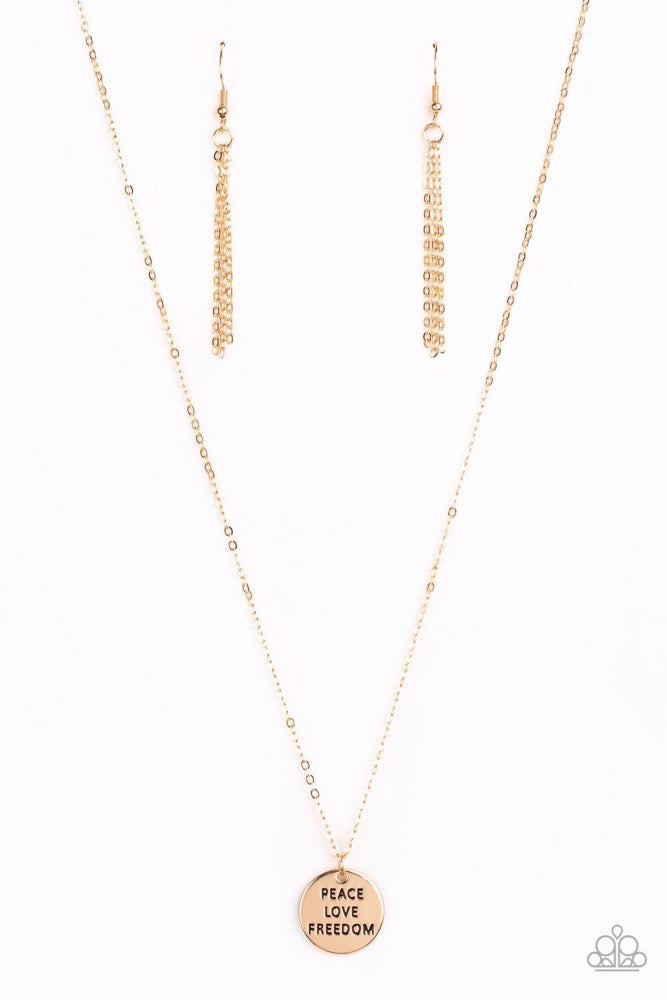 Stamped in the words, "Peace," "Love," and "Freedom," a glistening gold disc slides along a dainty gold chain below the collar for a patriotic inspired fashion. Features an adjustable clasp closure.