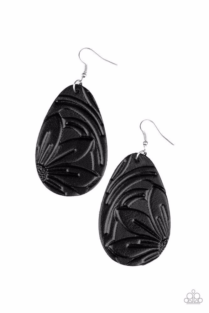 Stamped and embossed in floral detail, a black leather teardrop frame swings from the ear for a whimsically seasonal look. Earring attaches to a standard fishhook fitting.