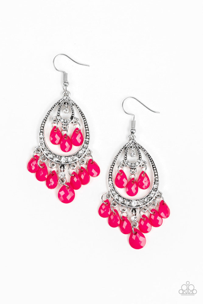 Faceted Pink Peacock teardrops swing from the top and bottom of a studded silver frame radiating with glassy white rhinestones for a flirtatious shine. Earring attaches to a standard fishhook fitting.