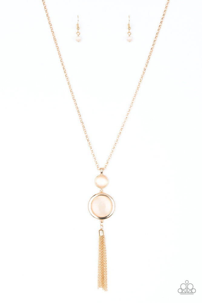 Swinging from the bottom of a glistening gold chain, glowing stacked moonstone pendants give way to a shimmery gold tassel for a refined look. Features an adjustable clasp closure.
