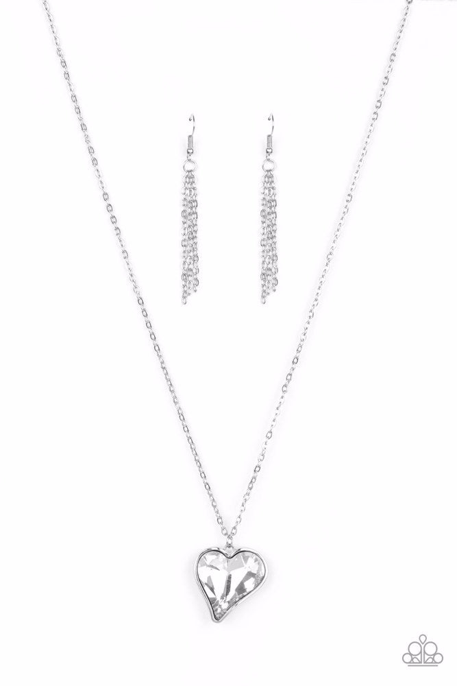 Chiseled into a charming heart, an oversized white rhinestone gem is nestled inside a sleek silver frame, creating a flirtatious pendant below the collar. Features an adjustable clasp closure.