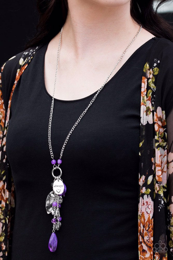Delicately hammered in shimmery textures, a handcrafted heart-shaped frame and a charm stamped in the charming phrase, "always" swings from the bottom of a shimmery silver hoop. Featuring glassy and opaque finishes, mismatched purple and silver beads dangle from the hoop for a whimsically tasseled finish. Features an adjustable clasp closure.
