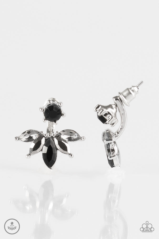 A solitaire black rhinestone attaches to a double-sided post, designed to fasten behind the ear. Encrusted in black, smoky, and hematite rhinestones, the double-sided post peeks out beneath the ear, creating a glittery fringe. Earring attaches to a standard post fitting.