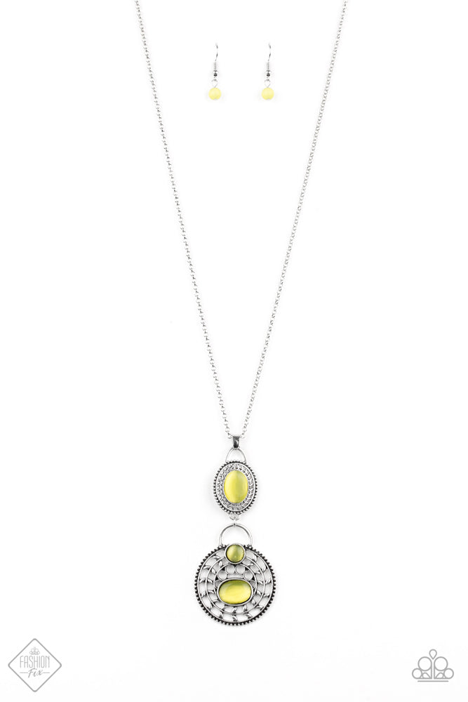 Dotted with glowing yellow cat's eye accents, two dizzying silver frames swing at the bottom of a lengthened silver chain. The stacked pendants swirl with studded patterns and vine-like filigree for a seasonal flair. Features an adjustable clasp closure.