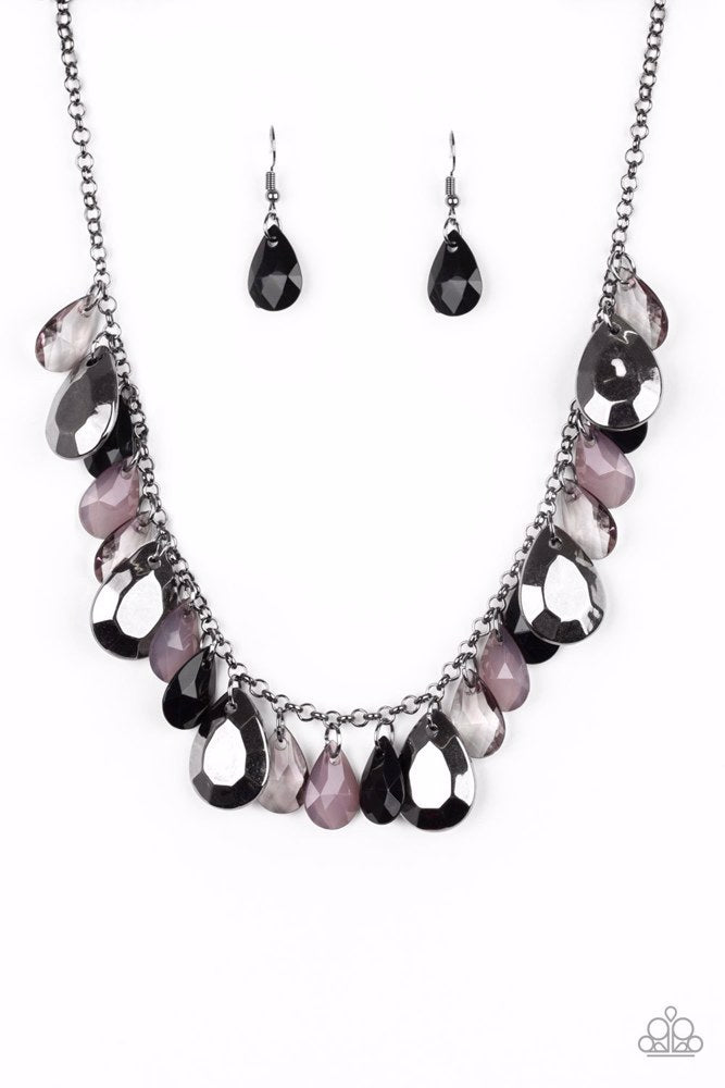 Polished black and smoky teardrops drip from the bottom of a shimmery gunmetal chain. Faceted gunmetal teardrops trickle between the colorful beading, adding a flashy finish to the flirtatious fringe. Features an adjustable clasp closure.