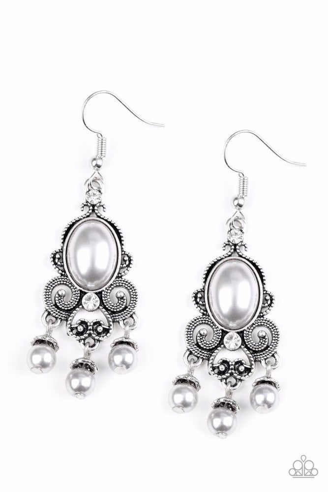 Dotted silver filigree spins around a pearly silver bead and dainty white rhinestones, coalescing into a regal frame. A pearly fringe swings from the bottom of the frame for a refined finish. Earring attaches to a standard fishhook fitting.