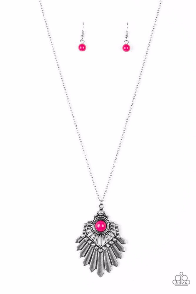 Infused with a lengthened silver chain, a polished pink bead is pressed into the center of a flared silver pendant for a bold tribal flair. Features an adjustable clasp closure.
