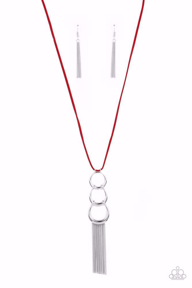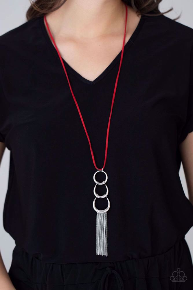 A bold silver ring gives way to two interlocking half moon silver frames at the bottom of a lengthened piece of red suede. Shimmery silver chains swing from the bottom of the display, adding flirty movement to the stationary pendant. Features an adjustable clasp closure.