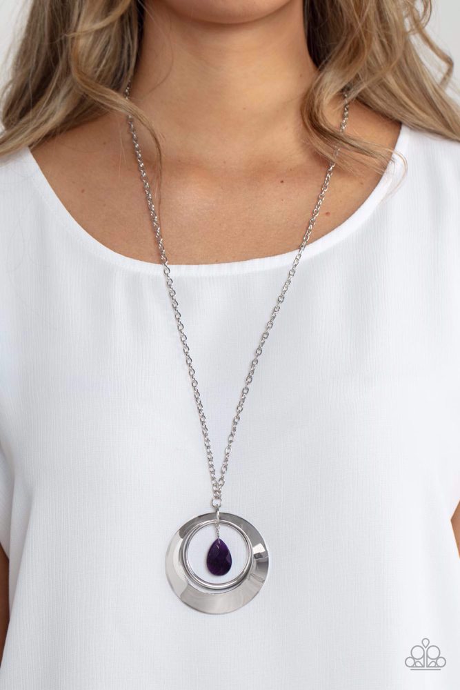 A faceted amethyst teardrop swings from the top of a bold silver ring and flared silver hoop, creating an enchanting pendant at the bottom of a lengthened silver chain. Features an adjustable clasp closure.