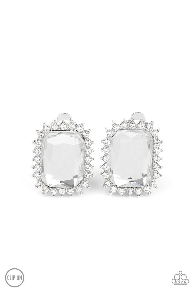 Featuring a regal emerald style cut, a dramatic white gem is pressed into the center of a silver frame radiating with glassy white rhinestones for a show-stopping look. Earring attaches to a standard clip-on fitting.