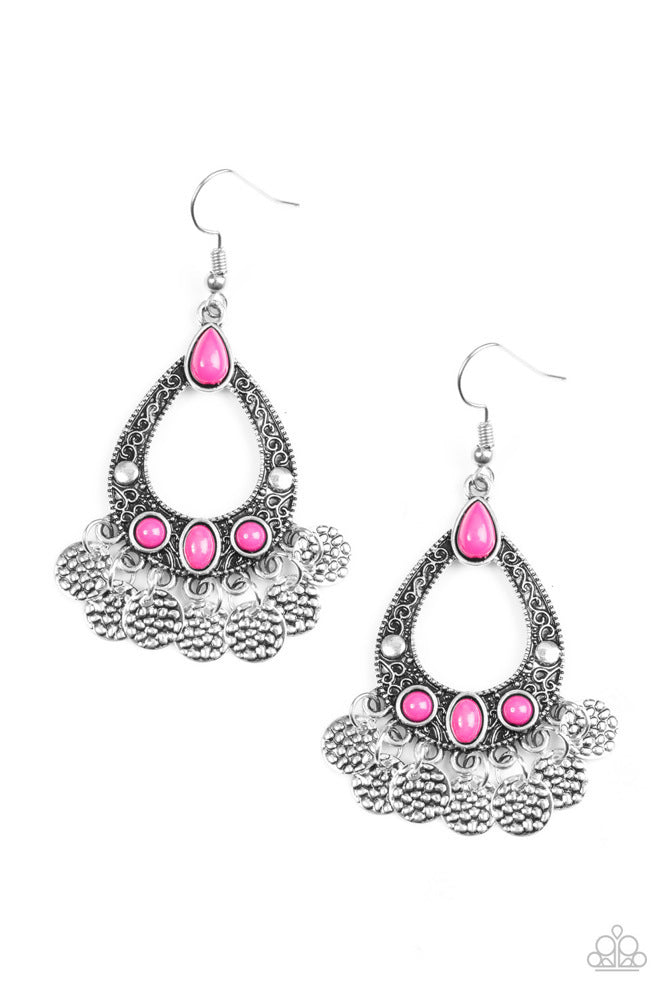 Playful pink beads are pressed into an ornate silver teardrop frame. Embossed in tactile texture, glistening silver discs swing from the bottom of the summery frame, creating a flirty fringe. Earring attaches to a standard fishhook fitting.