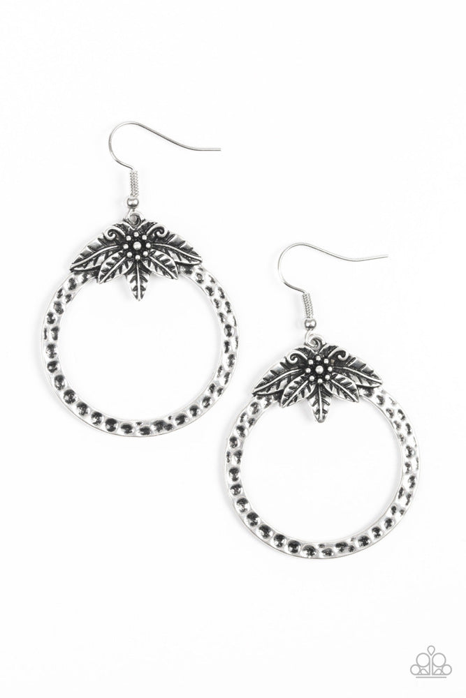 Featuring lifelike details, a flowery frame blooms across the top of a hammered silver hoop for a seasonal look. Earring attaches to a standard fishhook fitting.