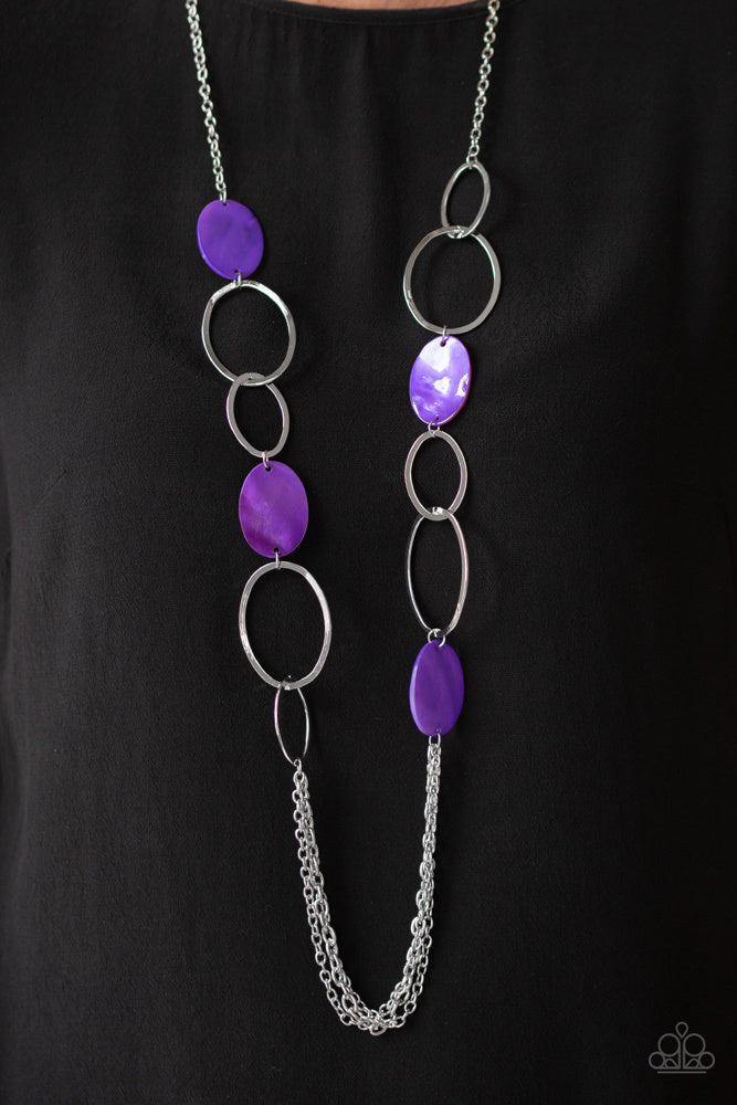 Brushed in a shell-like iridescence, a collection of flat purple beads and mismatched silver hoops give way to layers of silver chains down the chest for a whimsical look. Features an adjustable clasp closure.