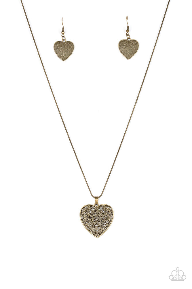 Filled with vine-like filigree detail, a brass heart pendant swings below the collar for a vintage inspired look. Features an adjustable clasp closure.