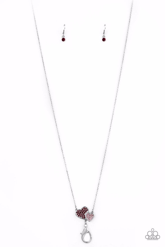 Red and pink rhinestone encrusted hearts join at the bottom of a lengthened silver chain, creating a charming pendant. A lobster clasp hangs from the bottom of the design to allow a name badge or other item to be attached. Features an adjustable clasp closure.