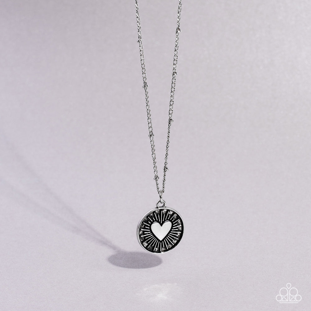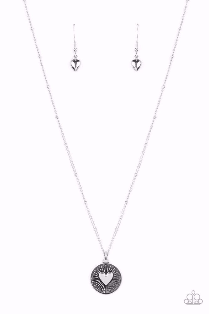 Embossed with a dainty heart, a silver pendant bursts from the center of a dainty silver satellite chain below the collar for a romantic flair. Features an adjustable clasp closure.