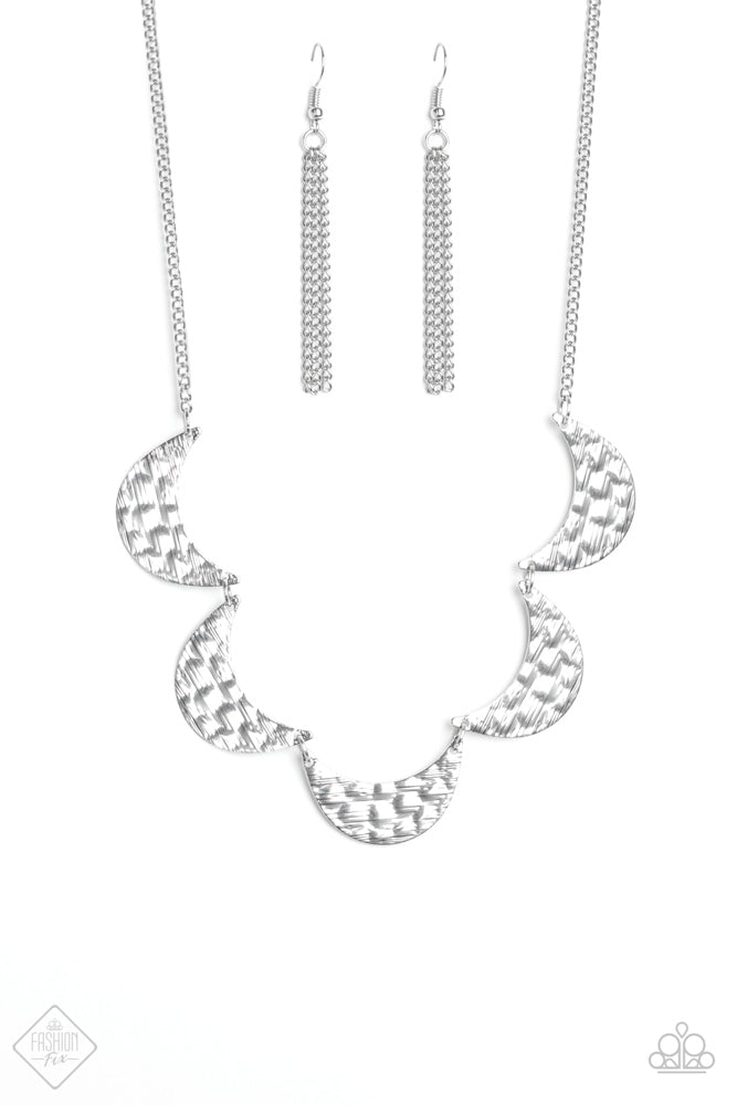 Embossed in metallic pebble-textures, delicately hammered half-moon silver frames link below the collar in a statement-making finish. Features an adjustable clasp closure.