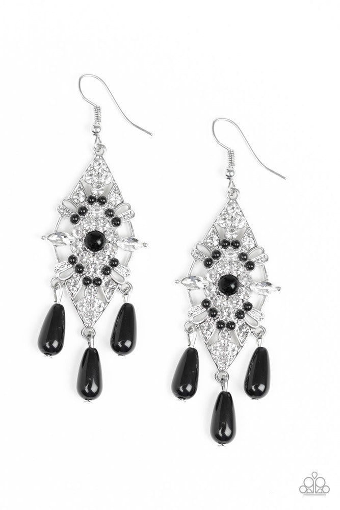 Dotted with dainty black beads, a silver kite-shaped frame is encrusted in glassy white rhinestones. Shiny black beads swing from the bottom of the sparkling frame for a refined flair. Earring attaches to a standard fishhook fitting.