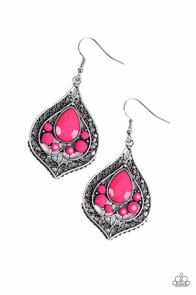 Featuring teardrop and round shapes, vivacious pink beads are pressed into the center of an ornate spade-shaped frame for a whimsical flair. Earring attaches to a standard fishhook fitting.