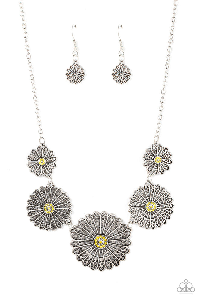 Infused with a whimsical mandala-like motif, tactile silver petals bloom from yellow rhinestone dotted centers below the collar. The mismatched silver flowers gradually increase in size, exaggerating the eye-catching details. Features an adjustable clasp closure.
