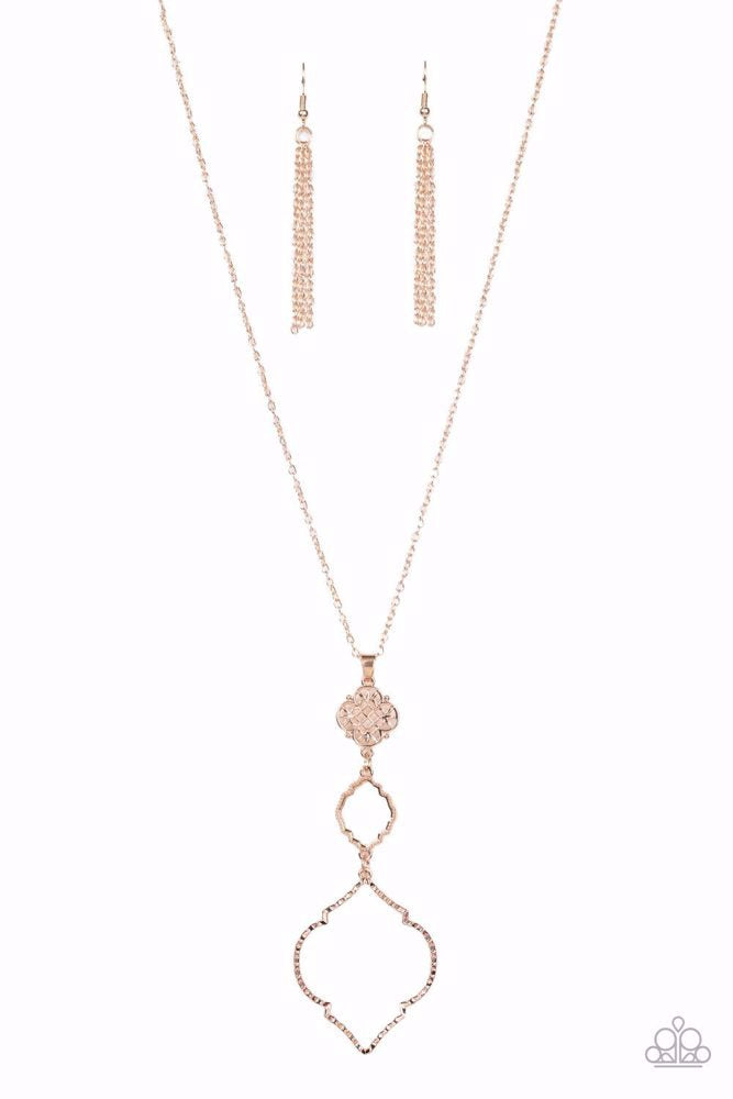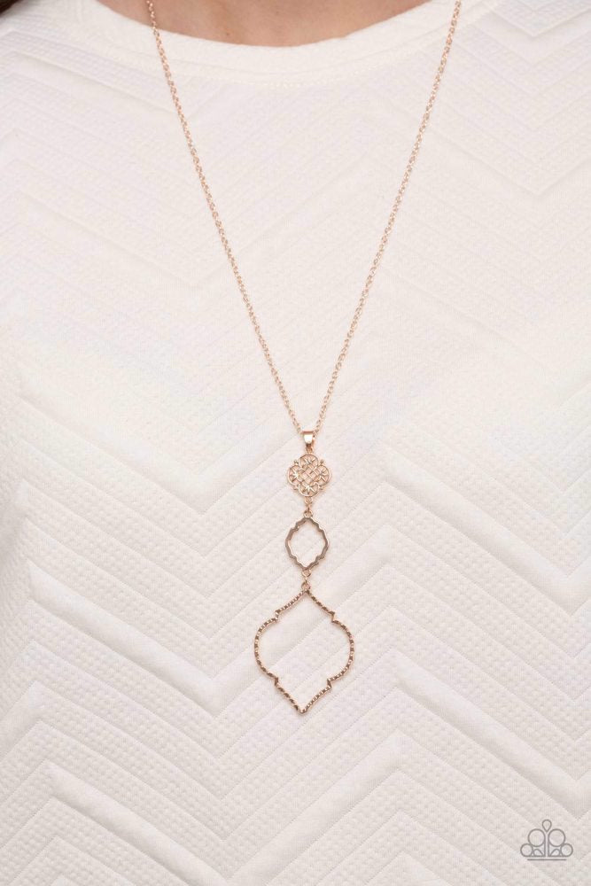 Featuring mandala-like patterns, a floral lattice frame gives way to mismatched scalloped rose gold frames, creating a magnificently stacked pendant at the bottom of an extended rose gold chain. Features an adjustable clasp closure.