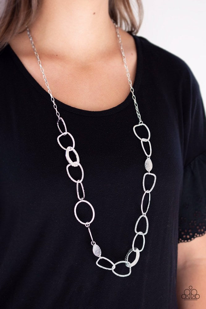 Delicately hammered in shimmery textures, asymmetrical silver frames and hoops connect into an edgy chain across the chest. Features an adjustable clasp closure.