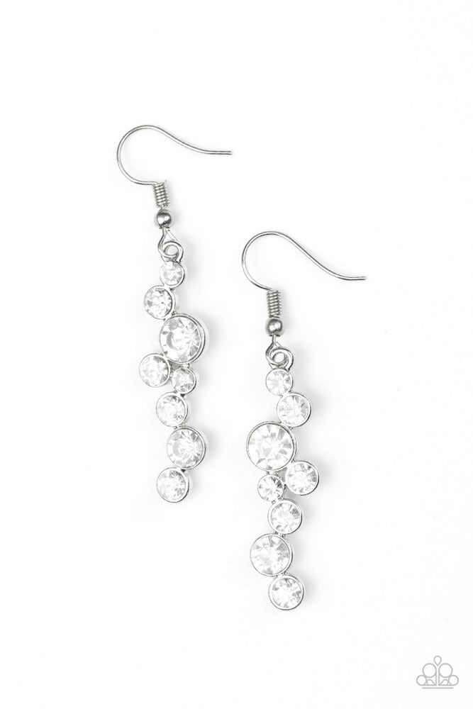 Varying in size, glittery white rhinestones tumble from the ear, coalescing into a magnificent lure. Earring attaches to a standard fishhook fitting.