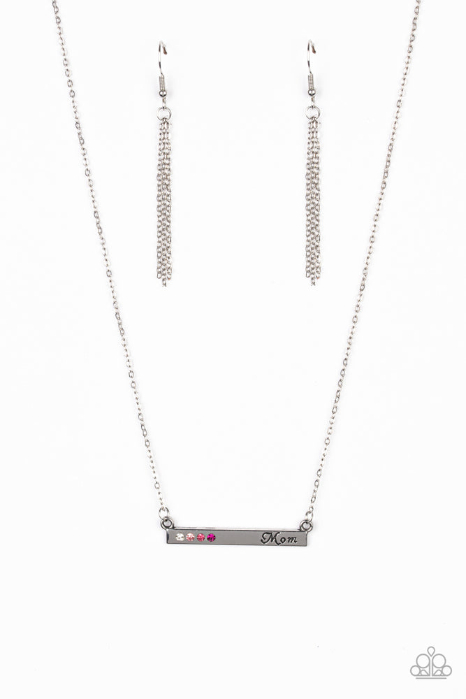 Dotted in dainty rhinestones that fade from white to dark blue, a dainty silver rectangular frame stamped in the word, "Mom", is suspended by a dainty silver chain below the collar for a charming look. Features an adjustable clasp closure.