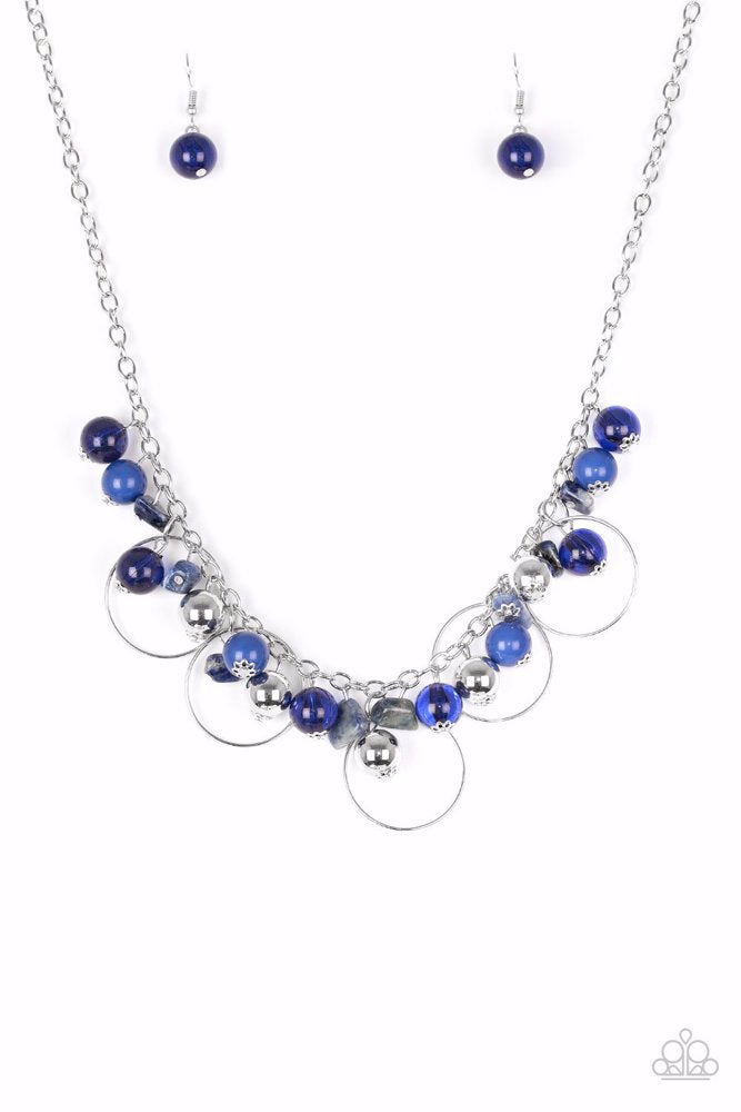Glassy blue, polished blue, and classic silver chains swing from the bottom of a shimmery silver chain. Infused with large silver hoops, bits of tranquil blue rock beading trickle between the beaded accent, creating an earthy fringe below the collar. Features an adjustable clasp closure.