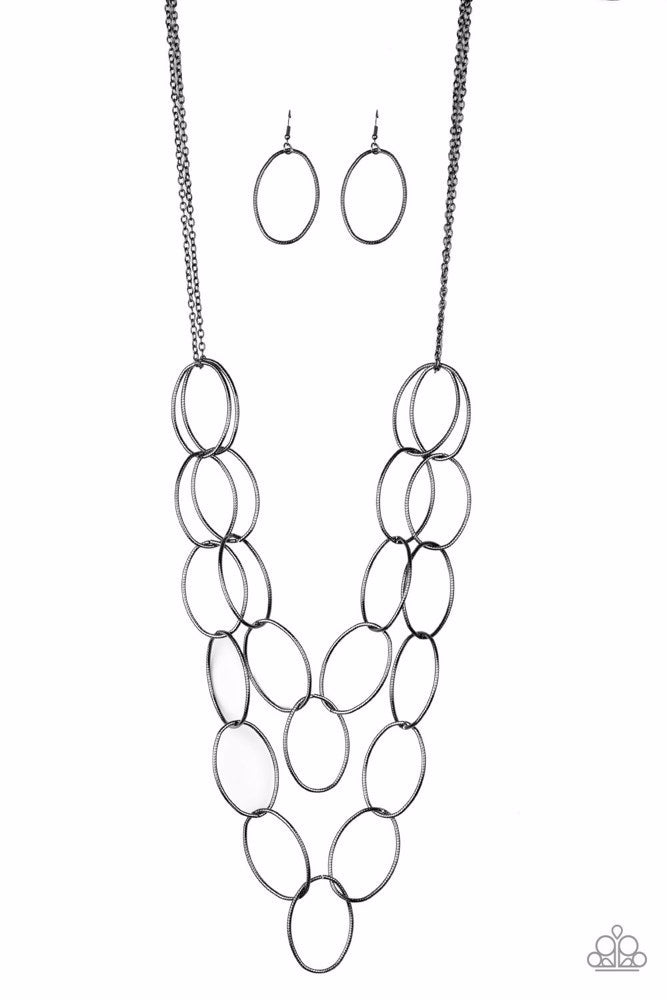 Etched in antiqued textures, pairs of oversized gunmetal ovals link across the chest for a bold industrial look. Features an adjustable clasp closure.