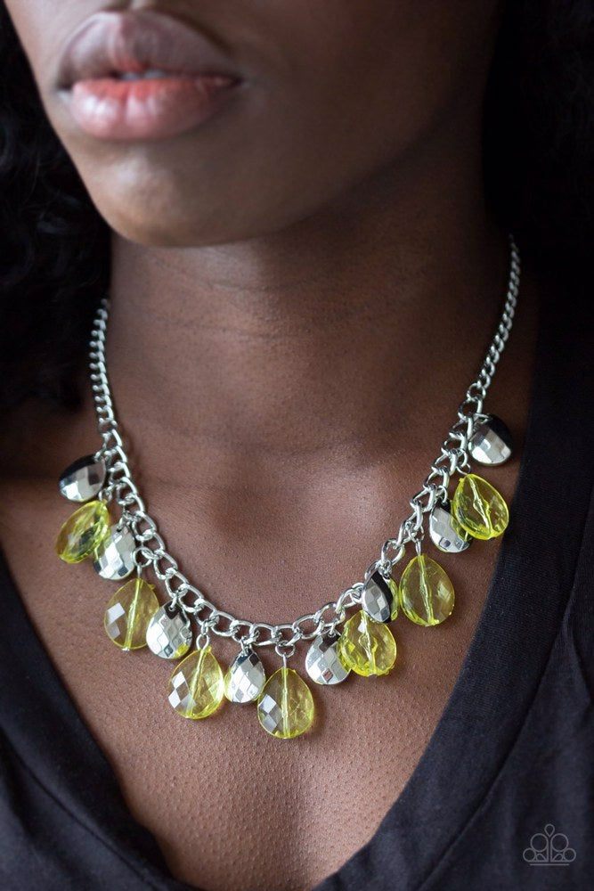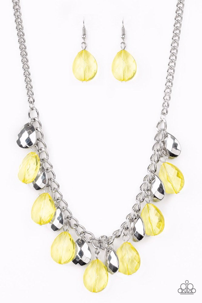 Faceted silver and glassy yellow teardrops swing from the bottom of a thick silver chain, creating a vivacious fringe below the collar. Features an adjustable clasp closure.