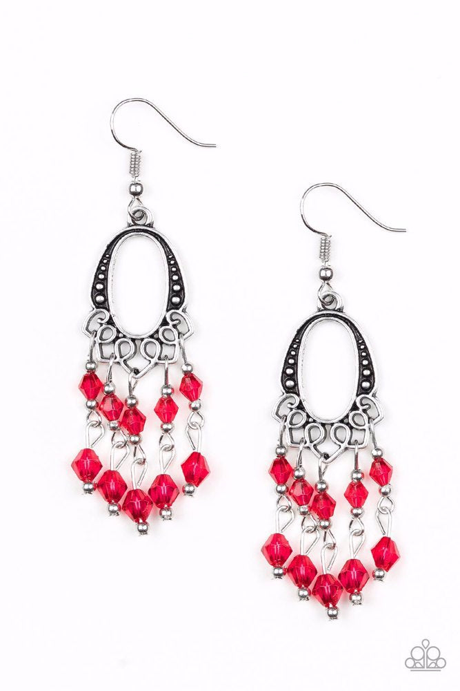 Glassy red beads cascade from the bottom of an ornate silver frame, creating a whimsical chandelier. Earring attaches to a standard fishhook fitting.