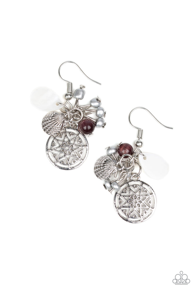 A collection of pearly silver seed beads, a shell-like teardrop, and a purple cat's eye bead trickles from the ear. Brushed in a shimmery finish, a silver seashell and nautical inspired frame are added to the clustered fringe for a whimsical finish. Earring attaches to a standard fishhook fitting.