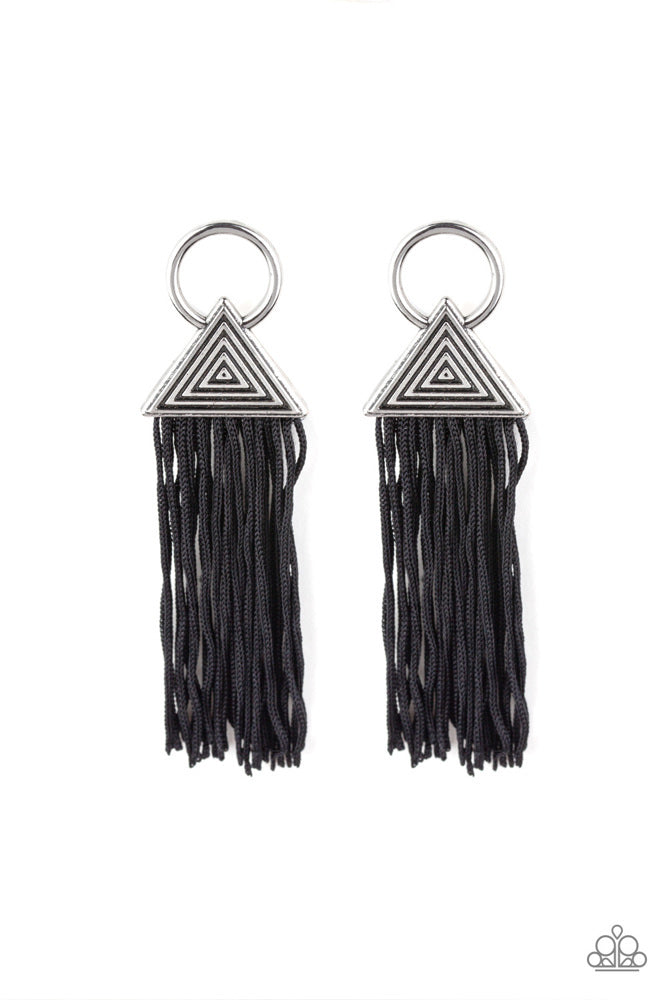 Shiny black cording streams from the bottom of a hypnotic triangular frame attached to an airy hoop, creating a dramatically tasseled look. Earring attaches to a standard post fitting.