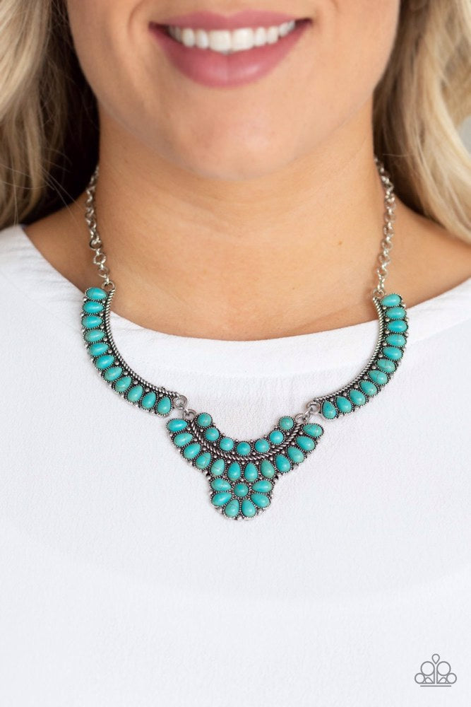 Featuring round and teardrop shapes, a collection of tranquil turquoise stone beads are pressed into interconnected silver plates, creating a refreshing floral inspired statement piece below the collar. Features an adjustable clasp closure.