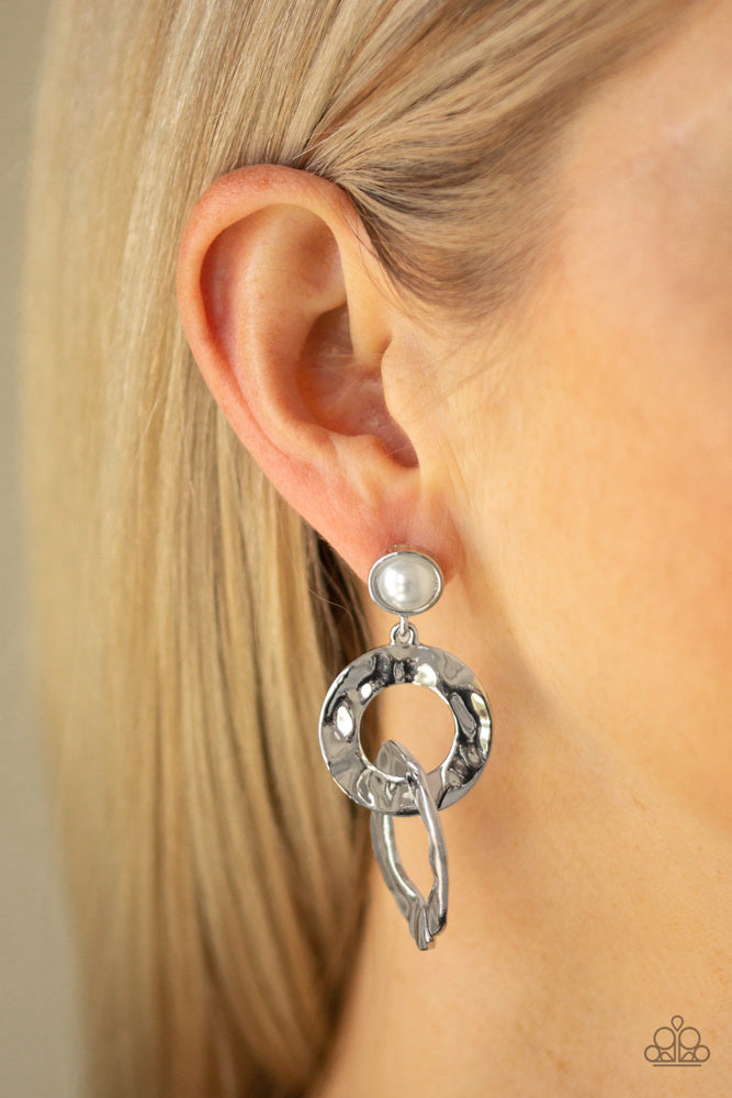 Hammered silver rings link at the bottom of a solitaire white pearl dotted frame for a refined edge. Earring attaches to a standard post fitting.