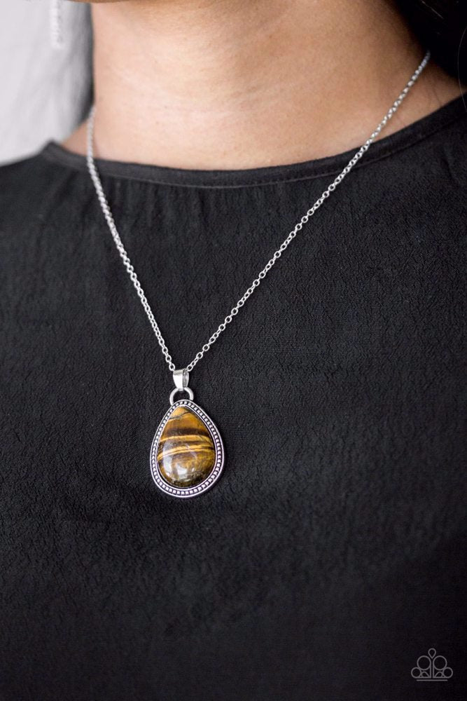 A teardrop tiger's eye stone is pressed into a studded silver frame, creating a tranquil pendant below the collar. Features an adjustable clasp closure.