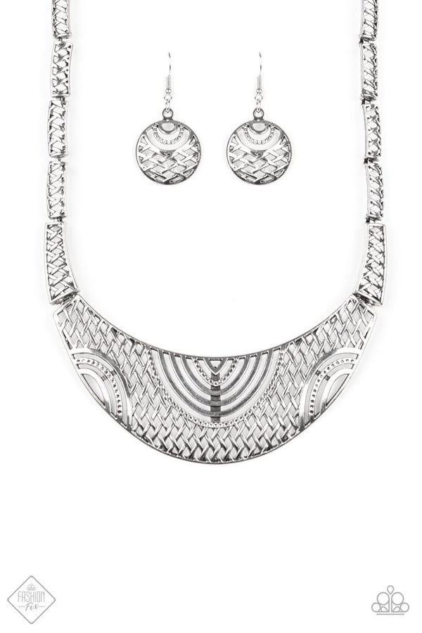 Featuring crisscrossed detail, dainty silver frames link below the collar, giving way to a dramatic half-moon plate radiating with dizzying tribal details for a fierce look. Features an adjustable clasp closure. Sold as one individual necklace. Includes one pair of matching earrings.