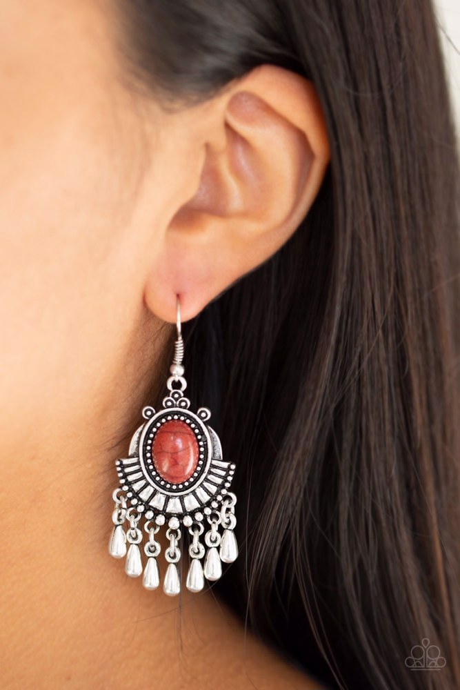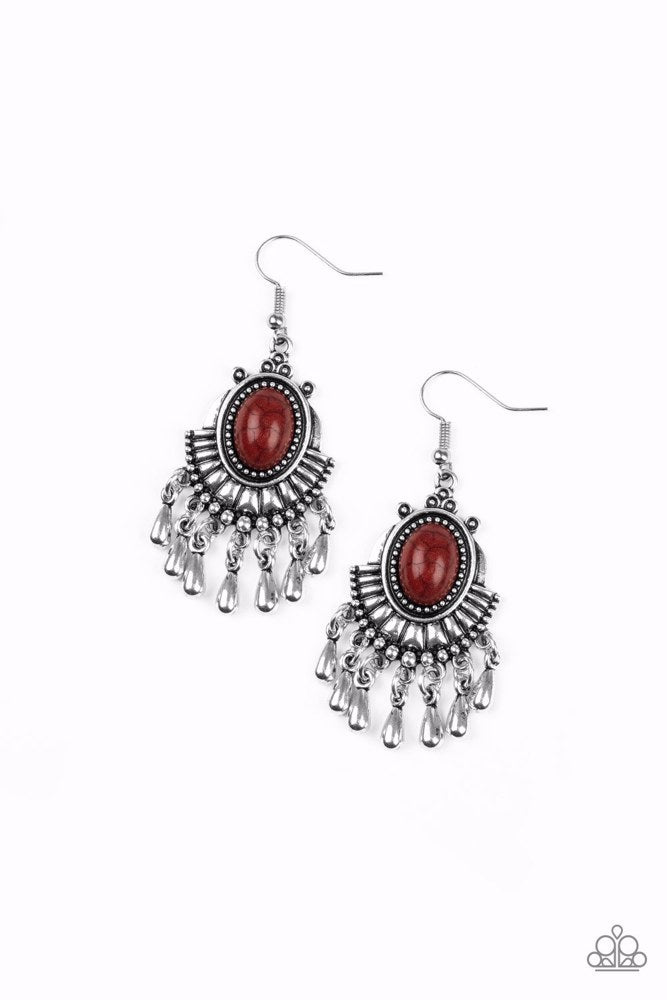 A smooth brown stone is pressed into the center of a textured silver frame for a seasonal look. Shiny silver teardrops drip from the bottom of the frame, creating a whimsical fringe. Earring attaches to a standard fishhook fitting.